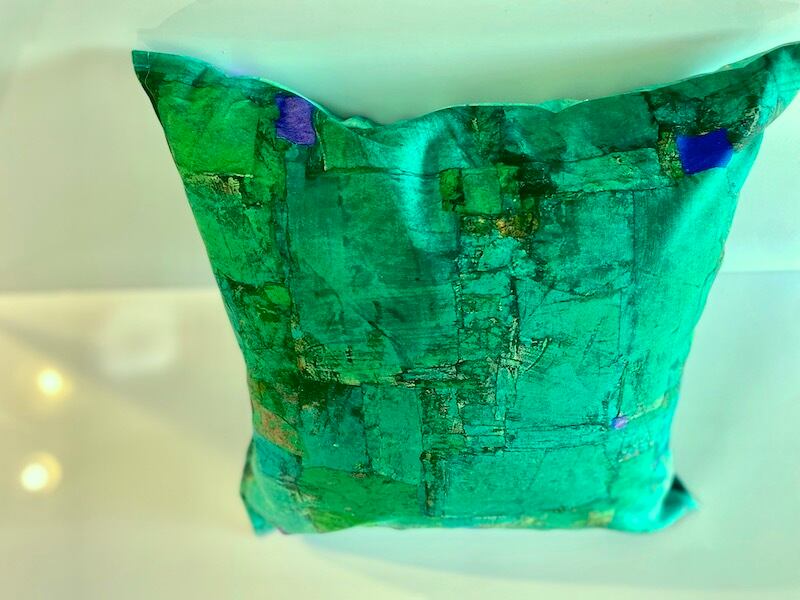 鮮やかなエメラルドグリーンの遺跡の街へ入りこんなような、無限的で美しい柄のクッションです。